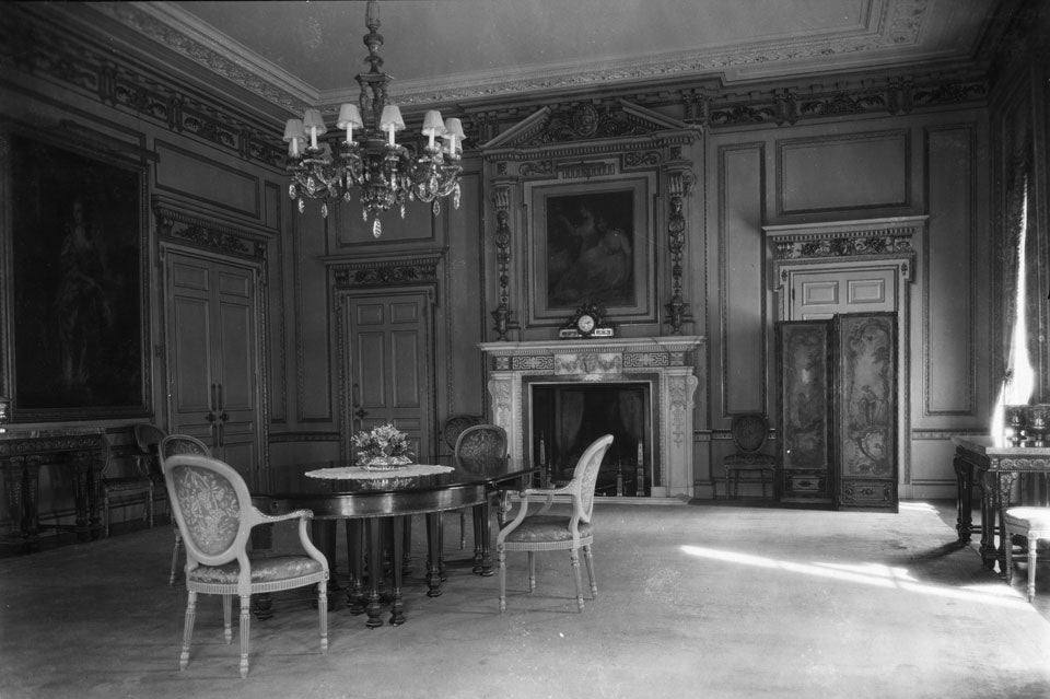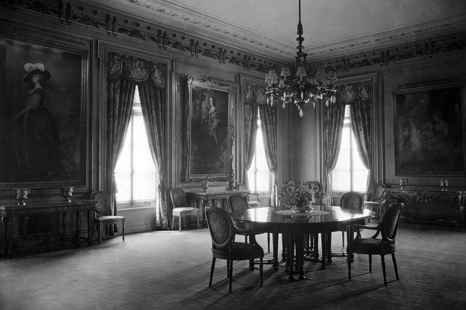Of noble proportions and of a style that recalls state dining rooms in English country houses of the 18th century, the Dining Room was an appropriate setting for the formal dinners that Mr. Frick hosted, at a rate of two per week, from October through May. Lining the walls are 18th-century British paintings, a customary choice for the dining room of a grand residence. Because the furniture in this room was to be used, it was modern. Mr. Frick’s interior designer, Sir Charles Allom, based his designs on English models of the 18th century. From the basement kitchen, food was sent up via a dumbwaiter to the adjoining Butler’s Pantry.