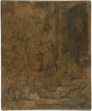Ten years after depicting Genesis 18 in oil, Rembrandt produced this very different treatment of the scene, now emphatically identifying one of the three visitors as the Lord. Two winged angels with distinctive, masculine features accompany him. These hybrid creatures are at once the travelers Abraham sees with his eyes and the divine messengers he is beginning to understand them to be. At the center of the image is Abraham’s son Ishmael, whose banishment was an eventual consequence of Isaac’s birth.