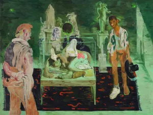 Salman Toor’s Museum Boys draws on the quiet domestic exchanges in Vermeer’s paintings. Set in an allegorical space filled with imaginary sculpture, a ghost-like figure in the foreground smiles coyly at a partially dressed man in the middle ground, echoing the mood of tipsy flirtation in Vermeer’s Officer and Laughing Girl. The sense of arrival and anticipation mirrors the exchange between the figures in Vermeer’s Mistress and Maid. Whereas the objects in Vermeer’s paintings illustrate the growing influence of the Dutch Republic on international trade, the surreal menagerie in Toor’s painting conjures queer mythology and colonial plunder. The heap of objects and limbs in the vitrine between the figures—a recurring motif in the artist’s work—signifies greed, lust, and exhaustion, a hectic consumerist orgy re-organized and re-compiled for a museum space. The vitrine hints at a darker aspect of Vermeer’s prosperous subjects, beneficiaries of the global trade of spices, porcelain, and much more.